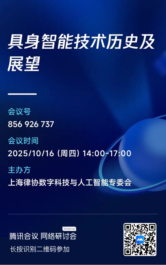 為幫助本市研究人工智能法律的執(zhí)業(yè)律師深入了解生成式人工智能、具身智能技術歷史及展望相關問題,促進提升對人工智能產業(yè)認知及專業(yè)服務能力,上海律協(xié)數(shù)字科技與人工智能專業(yè)委員會舉辦“數(shù)智未來,護航AI”之“具身智能技術歷史及展望”講座。具體安排如下: