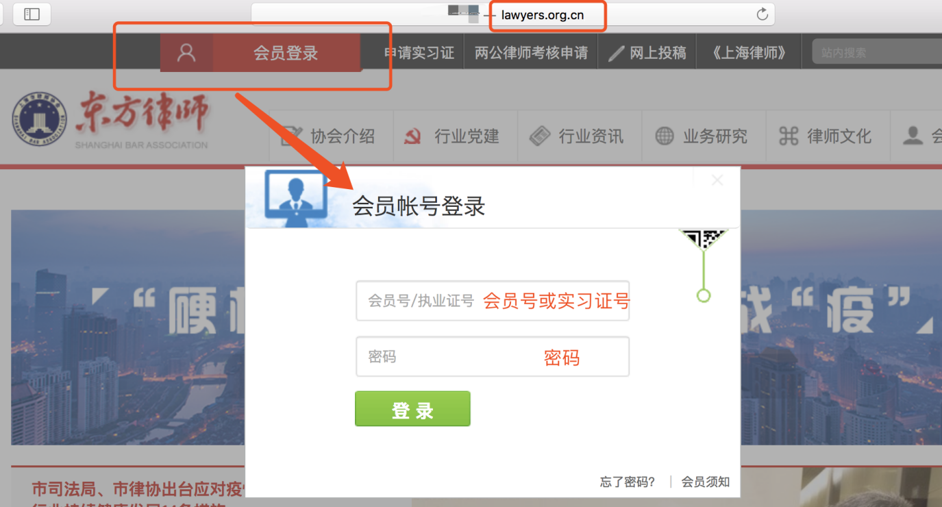 (一)打開東方律師網(wǎng),點(diǎn)擊會員登錄,使用實(shí)習(xí)證號和密碼登錄后進(jìn)入會員中心,點(diǎn)擊報(bào)名繳費(fèi):