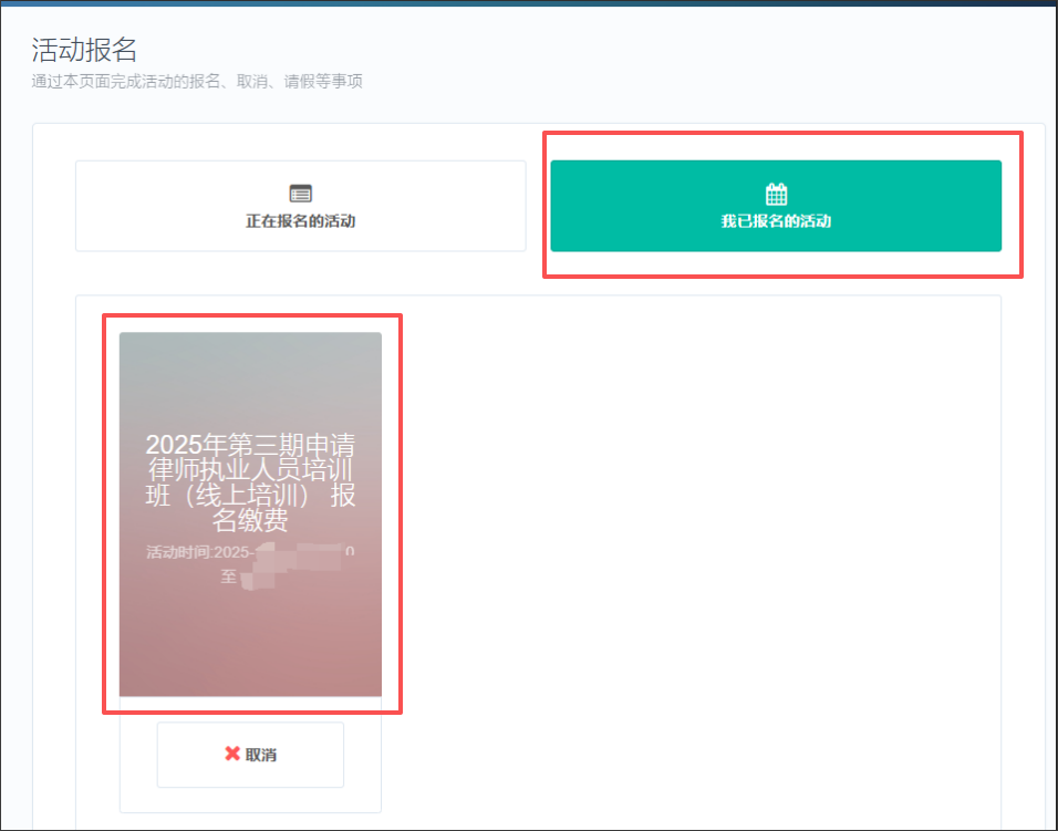 4.點(diǎn)擊“已報(bào)名活動”,選擇“2025年第三期申請律師執(zhí)業(yè)人員培訓(xùn)班”,點(diǎn)擊“繳費(fèi)”;