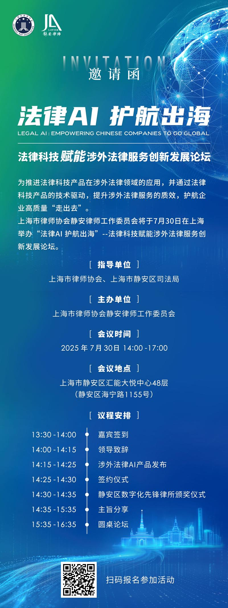 本次 “法律AI 護航出海”——法律科技賦能涉外法律服務(wù)創(chuàng)新發(fā)展論壇將在7月30日下午隆重舉行。此次論壇在上海市律師協(xié)會、上海市靜安司法局的指導(dǎo)下,由上海市律師協(xié)會靜安律師工作委員會精心主辦,旨在搭建一個高端、專業(yè)、開放的交流平臺,匯聚各方智慧,共同探討法律科技在涉外法律服務(wù)領(lǐng)域的創(chuàng)新應(yīng)用與未來發(fā)展。