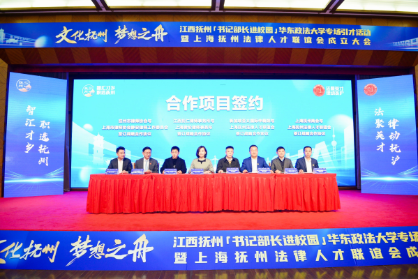 12月23日,以“文化撫州、夢(mèng)想之舟”——華東政法大學(xué)“校園撫州日”為主題的江西撫州“書記部長(zhǎng)進(jìn)校園”華東政法大學(xué)專場(chǎng)引才活動(dòng)暨上海撫州法律人才聯(lián)誼會(huì)成立大會(huì)在此舉行。江西撫州市委書記魏曉奎,華東政法大學(xué)黨委副書記、紀(jì)委書記應(yīng)培禮,江西省政府駐上海辦事處黨組成員、副主任姚軍章,江西撫州市委常委、市委組織部部長(zhǎng)肖妮娜,江西撫州市人大常委會(huì)副主任、市委秘書長(zhǎng)趙榮貴,上海市靜安區(qū)司法局黨委書記、局長(zhǎng)呂平和靜安區(qū)律師工作委員會(huì)主任丁德應(yīng),上海市律協(xié)靜安區(qū)律師工作委員會(huì)副主任邵開俊、張玉霞等領(lǐng)導(dǎo)、嘉賓出席本次活動(dòng)。